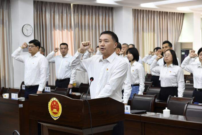 宣誓仪式现场,全体人员奏唱中华人民共和国国歌,在江永良检察长的带领下,面对国徽朗诵誓词,进一步坚定对宪法的信仰以及维护宪法权威、捍卫宪法尊严的决心,坚持求真务实、担当实干、认真履行法律监督各项职能,为建设富强民主文明和谐美丽的社会主义现代化强国努力奋斗。
