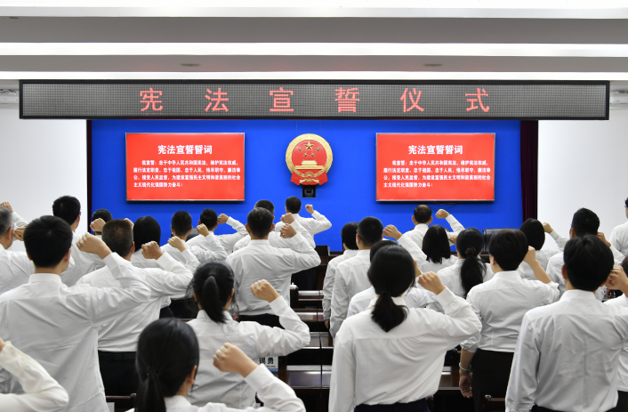 宣誓仪式现场,全体人员奏唱中华人民共和国国歌,在江永良检察长的带领下,面对国徽朗诵誓词,进一步坚定对宪法的信仰以及维护宪法权威、捍卫宪法尊严的决心,坚持求真务实、担当实干、认真履行法律监督各项职能,为建设富强民主文明和谐美丽的社会主义现代化强国努力奋斗。