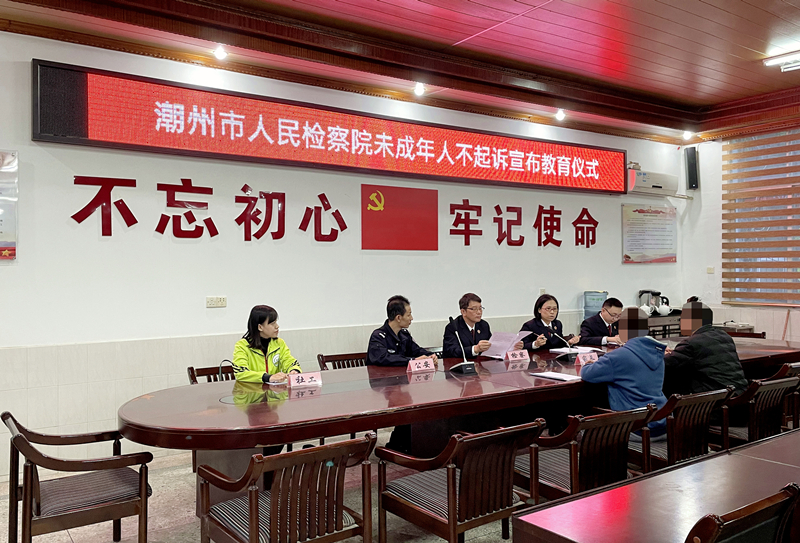 2020年8月,市检察院对詹某某涉嫌寻衅滋事罪一案作出了附条件不起诉的决定并设定了6个月的考验期。考验期满,詹某某经考察合格,市检察院依法对詹某某作出不起诉决定。2021年3月4日,该案主任检察官陈伊拉检察长到饶平县新丰派出所为詹某某举行不起诉宣告仪式。
